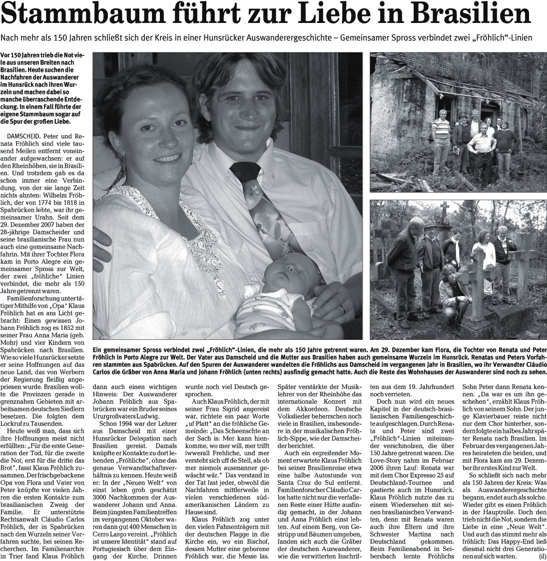 Im Februar 2006 weilte die brasilianische Gruppe "EXPRESSO25" im Hunsrück. Sie führte in Argenthal und Reich mit großen Erfolg ein vielbachtetes Musical auf. Die mehr als 40 köpfige Gruppe hatten wir privat in Gastfamilien untergebracht. Bei unserer Reise im Oktober 2007 nach Brasilien haben uns die Mitglieder der Gruppe EXPRESSO25 einen herzlichen Empfang und einen wunderschönen Abend im Deutsch-Brasilianischen Kulturzentrum geboten. Dort erfuhren wir dann auch, dass die Tournee nicht ganz ohne "Folgen" geblieben ist. Renata Fröhlich aus Porto Alegre/Brasilien hat bei ihrem Aufenthalt im Hunsrück Peter Fröhlich aus Damscheid/Deutschland kennen und schätzen gelernt. Die beiden haben sich verliebt, geheiratet und mittlerweile Nachwuchs bekommen, den sie uns stolz gezeigt haben. Die Familie lebt heute in Porto Alegre in Brasilien.